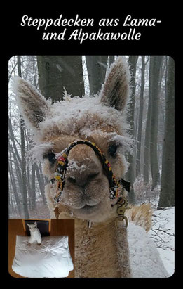 Steppdecken mit der Wolle m e i n e r Lamas und Alpakas (2/3 Alpaka- und/oder Lamawolle sowie 1/3 ökozertifizierte und biologisch gewaschene Schafwolle